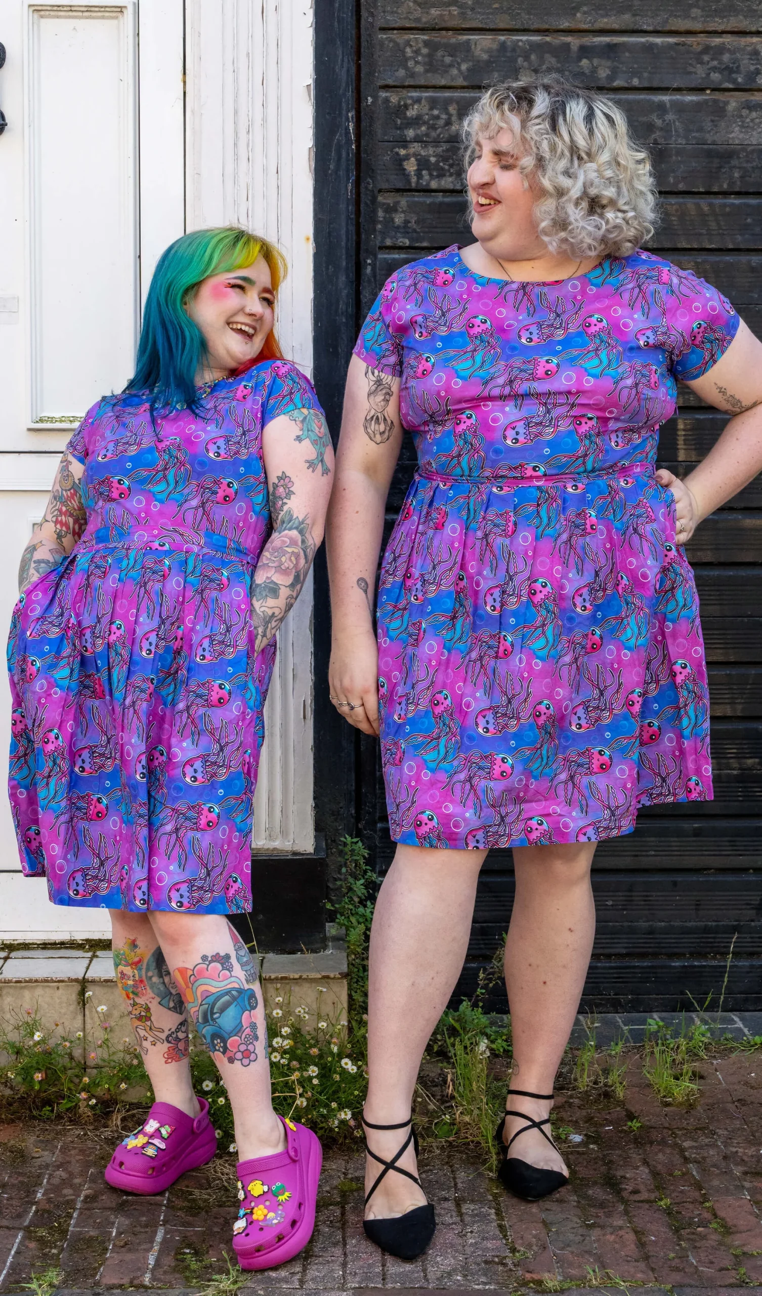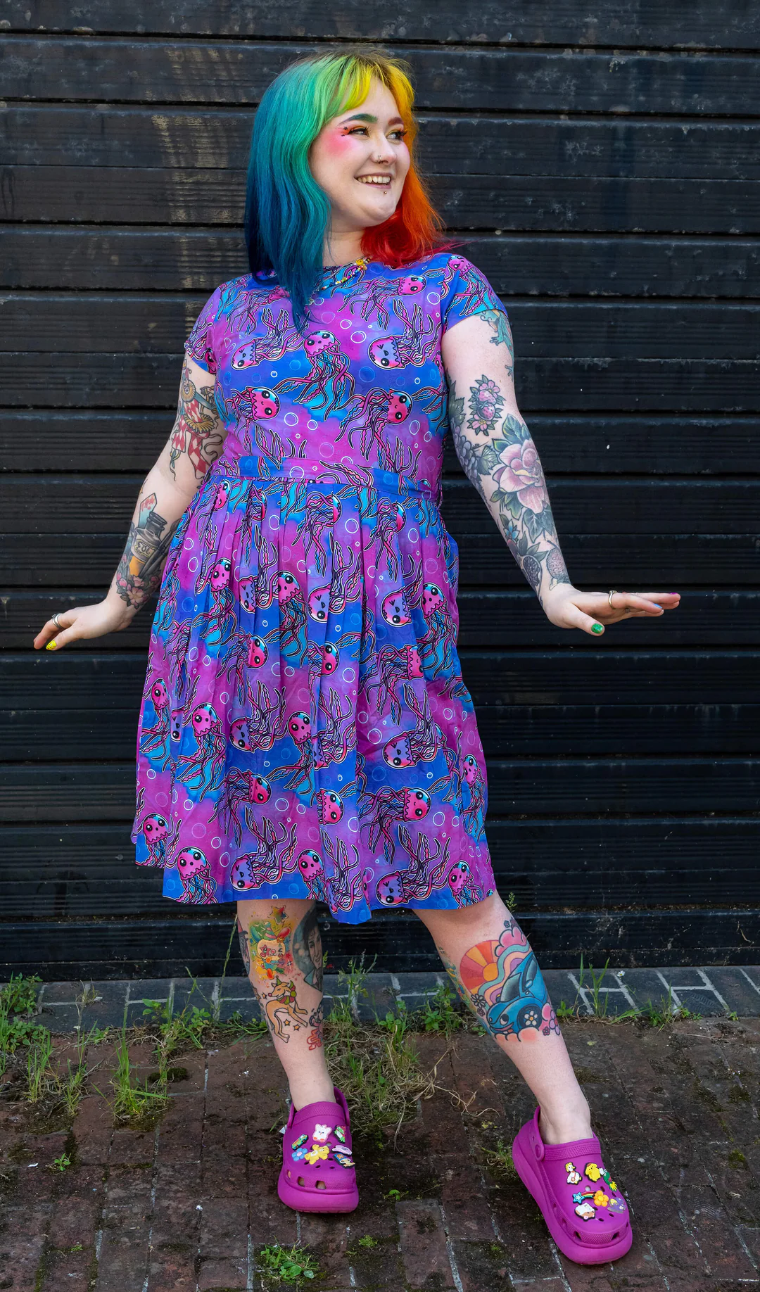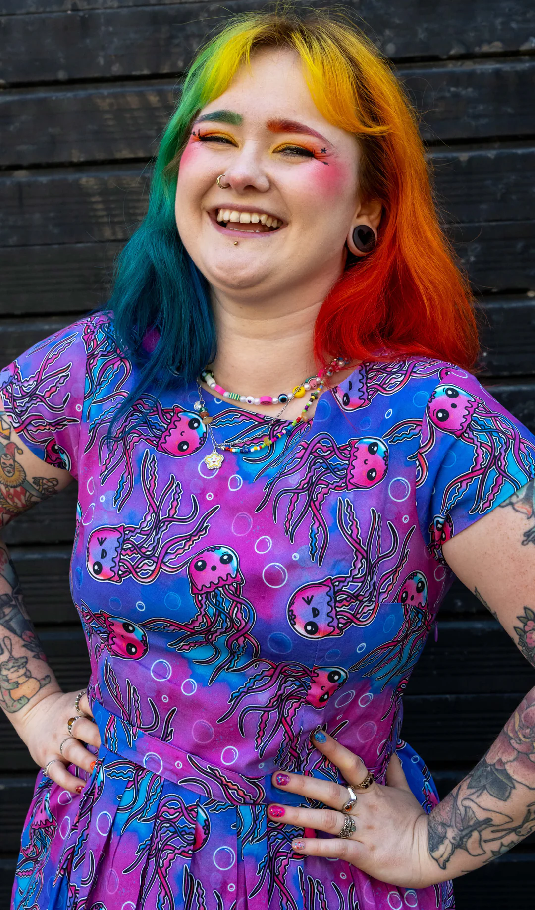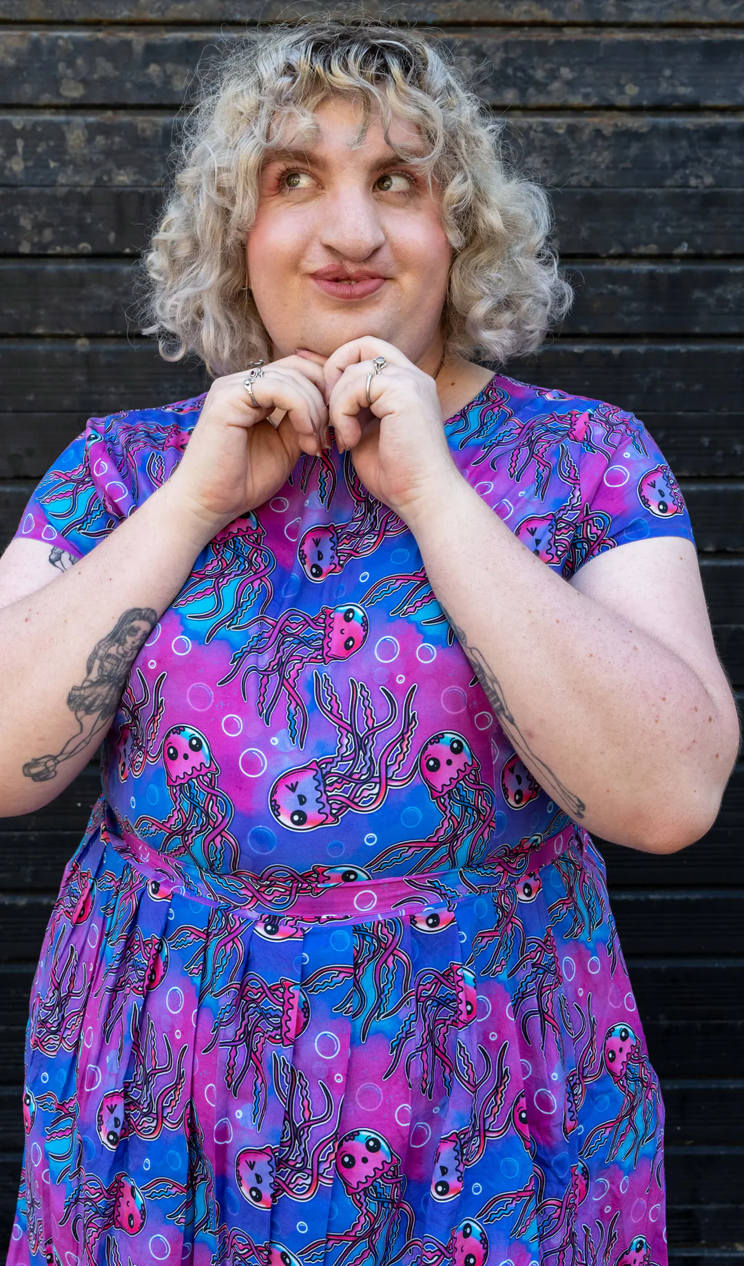 Jazz up your wardrobe with this Jellyfish Stretch Belted Tea Dress! The unique jellyfish print adds a playful touch to this classic tea dress. And with pockets and a stretchy material, it’s as practical as it is stylish. Say goodbye to boring dresses and hello to this quirky gem!