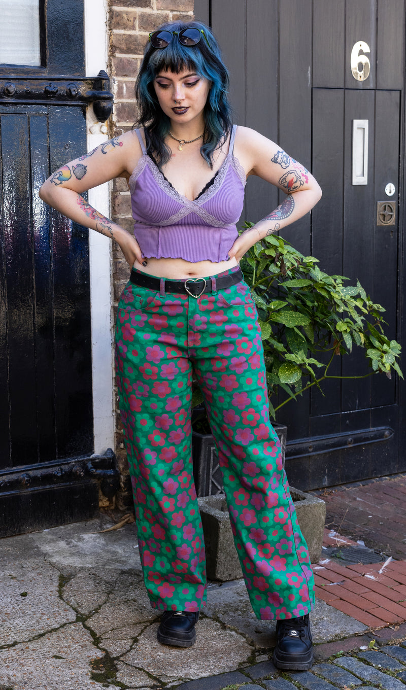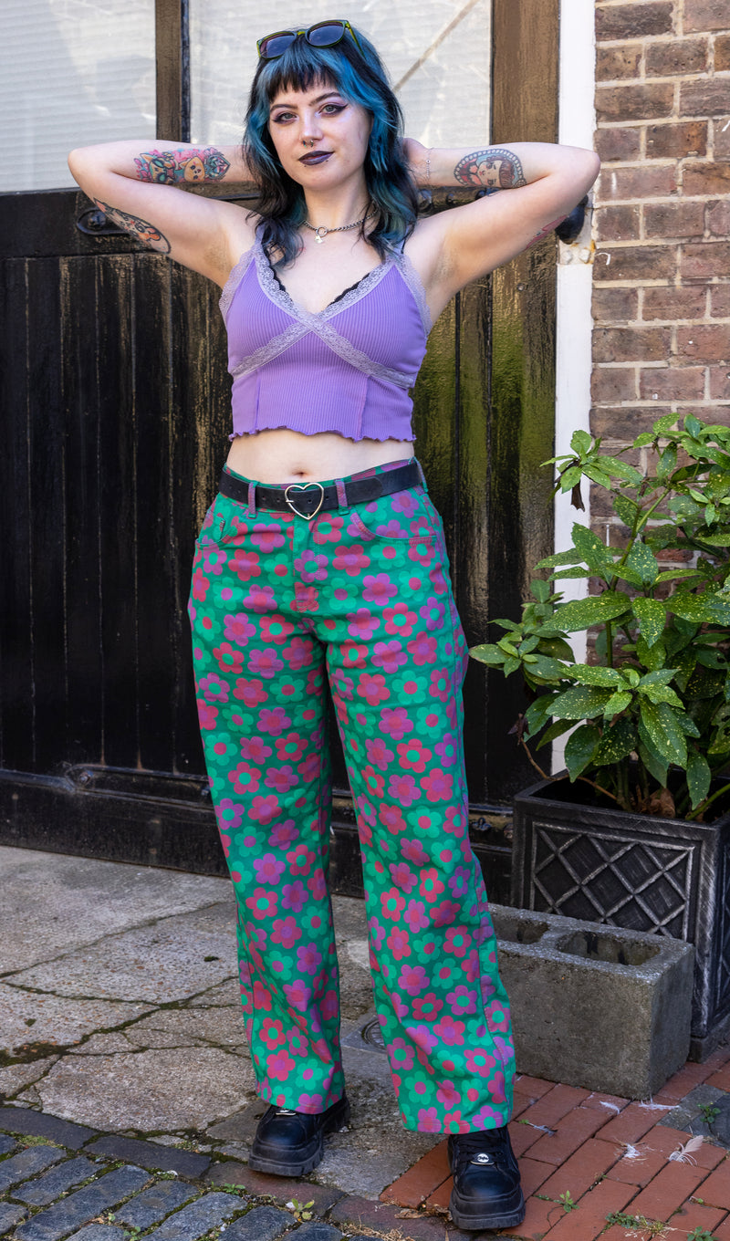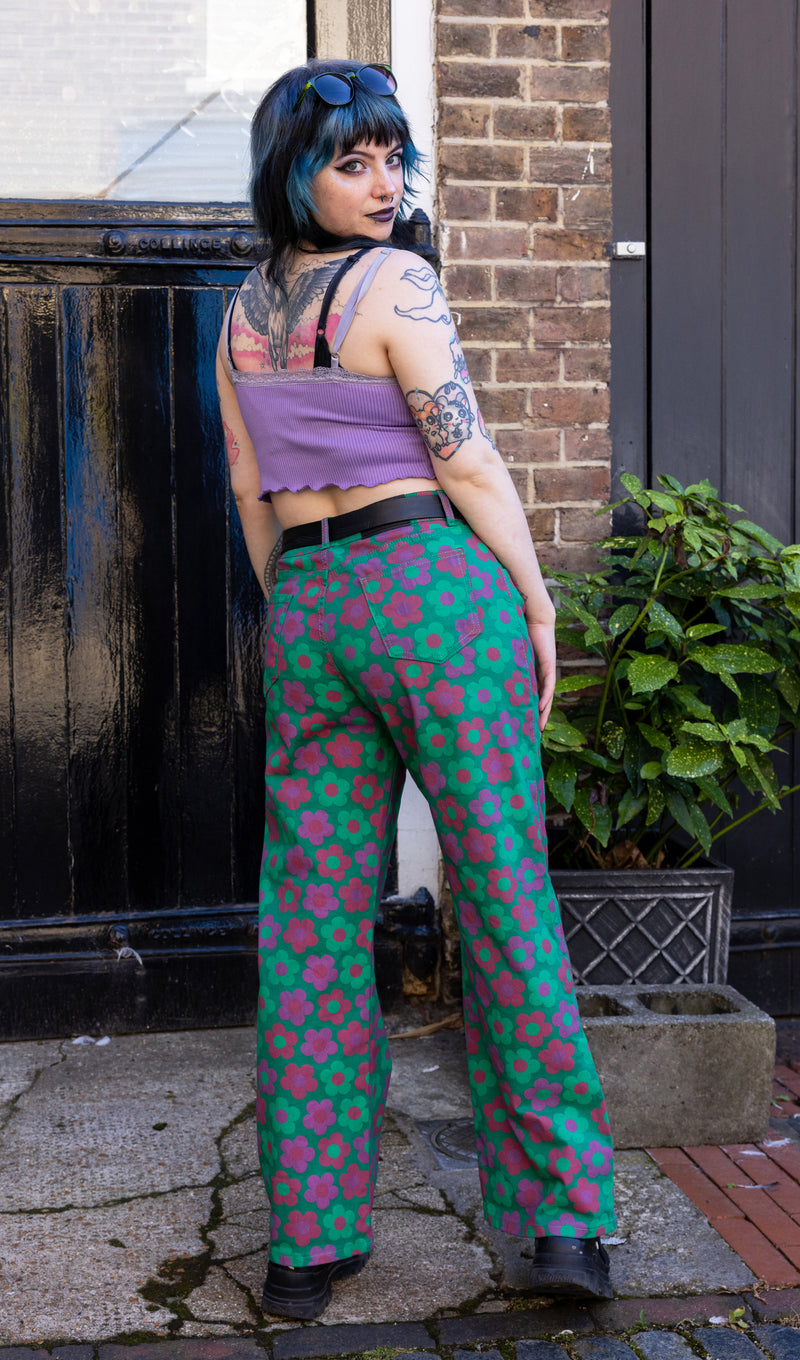 Gorgeous 90’s Style Wide Leg Stretch Jeans with an all over Green, Red and Pink Flowers on a Green Base. 30″ Inseam.
