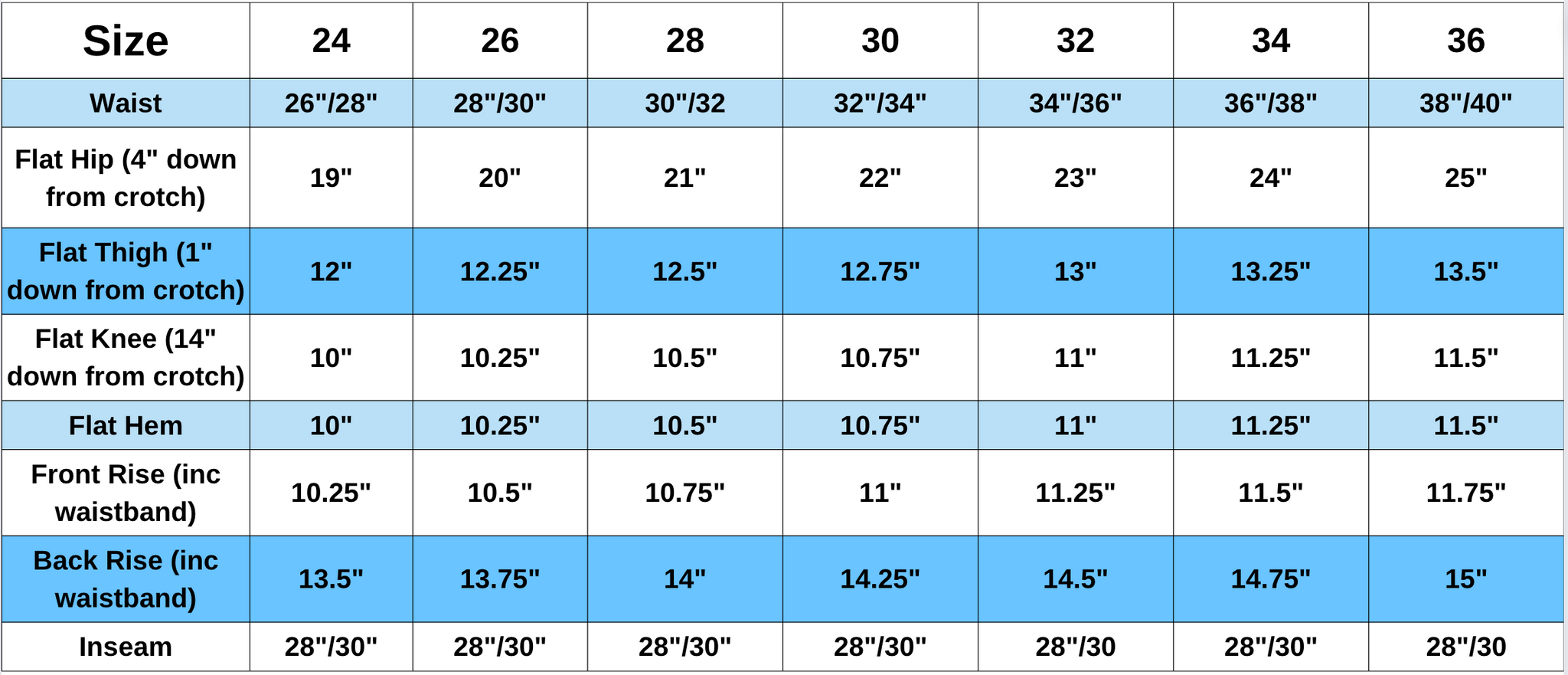 Please also refer to the size chart below as our waist measurements are an oversized, mid-rise fit.