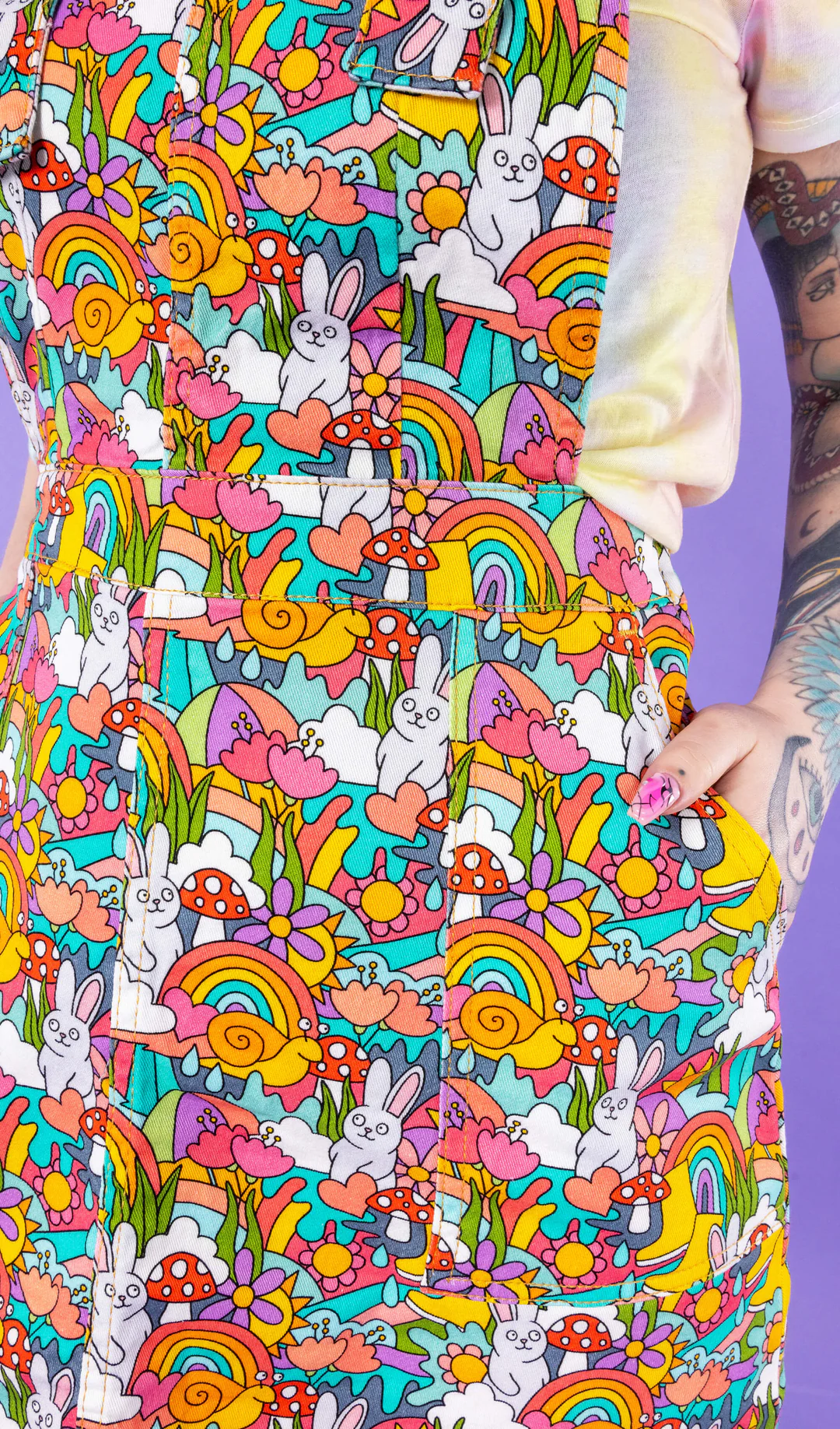 Hop into style with the Some Bunny Loves You Pinafore Dress by Waffle Mama Design. Adorned with playful bunnies, rainbows, and mushrooms, this stretch twill dress will add a whimsical touch to any outfit. Perfect for those who love a little fun in their wardrobe!