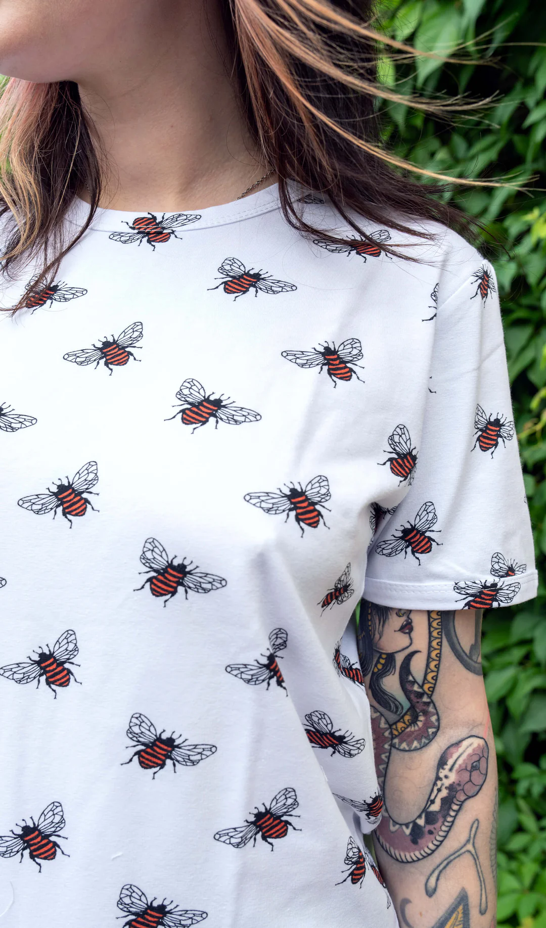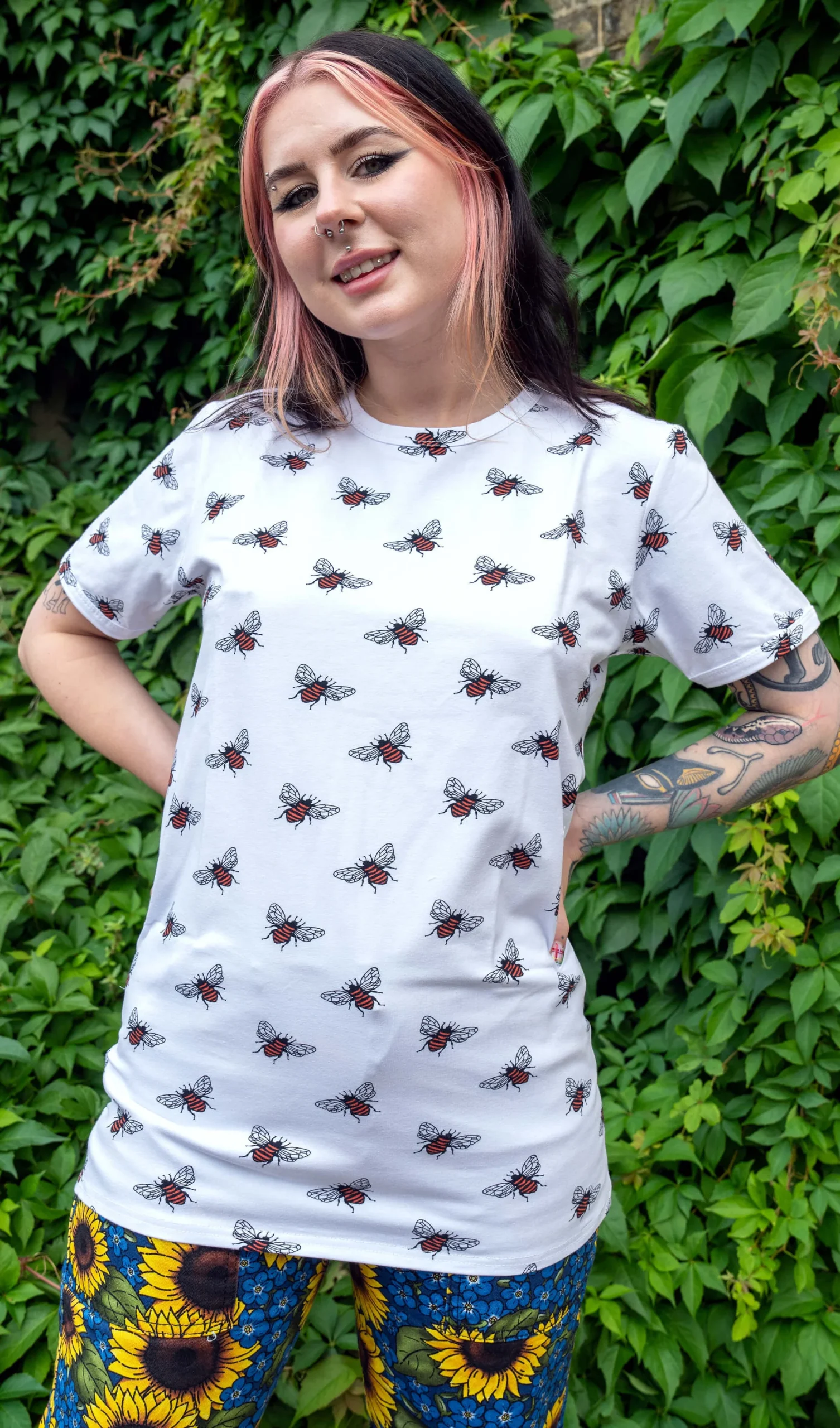 White t-shirt covered in a bumblebee print.