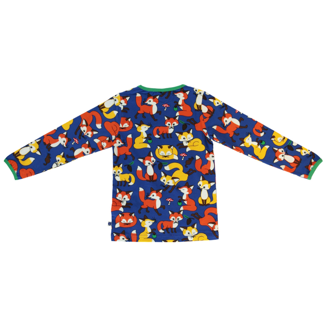 A blue long sleeved top featuring foxes in orange and yellow and toadstools.  Trim at neck and cuffs is green.