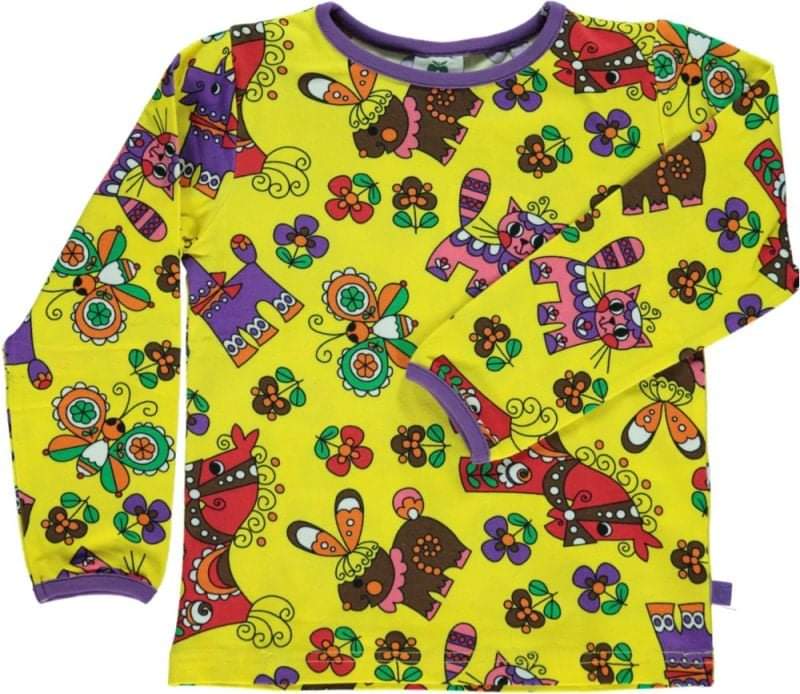 Småfolk have really embraced the retro vibe this season and I just love it. A bright yellow long sleeved top with purple ribbing at the cuffs and neck. This top is bursting with colourful animals drawn in a folk art style.