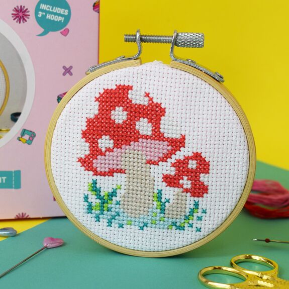 Inspired by woodland walks in glorious forests, this toadstool mini cross stitch is a perfect project for nature lovers. The red really pops against the white fabric – it’s a joyous one to stitch!