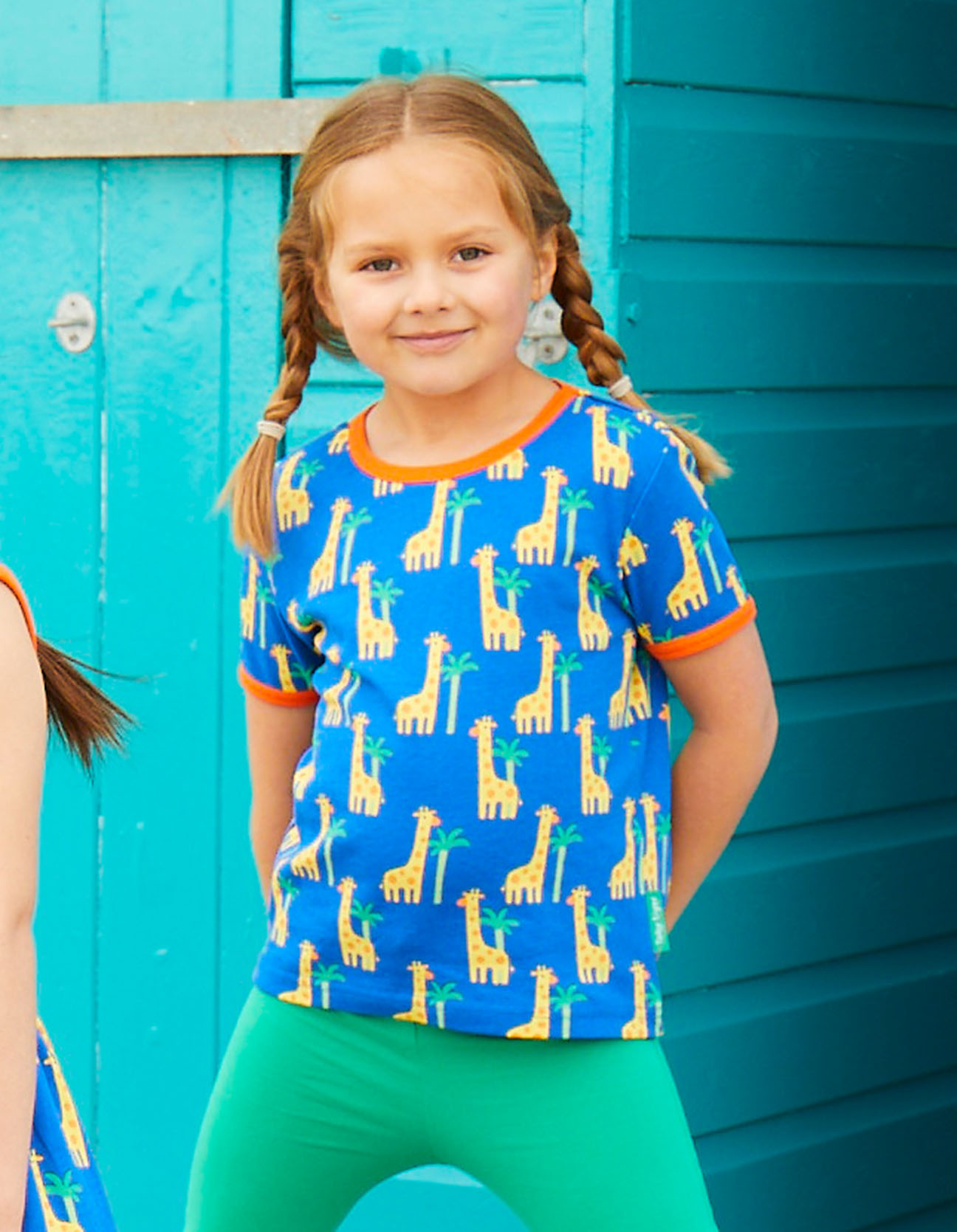 This cool, organic cotton short-sleeve T-shirt features our long-legged pal on stylish navy cotton with contrasting orange trim. Kids will love this playful look, with neck poppers on smaller sizes.