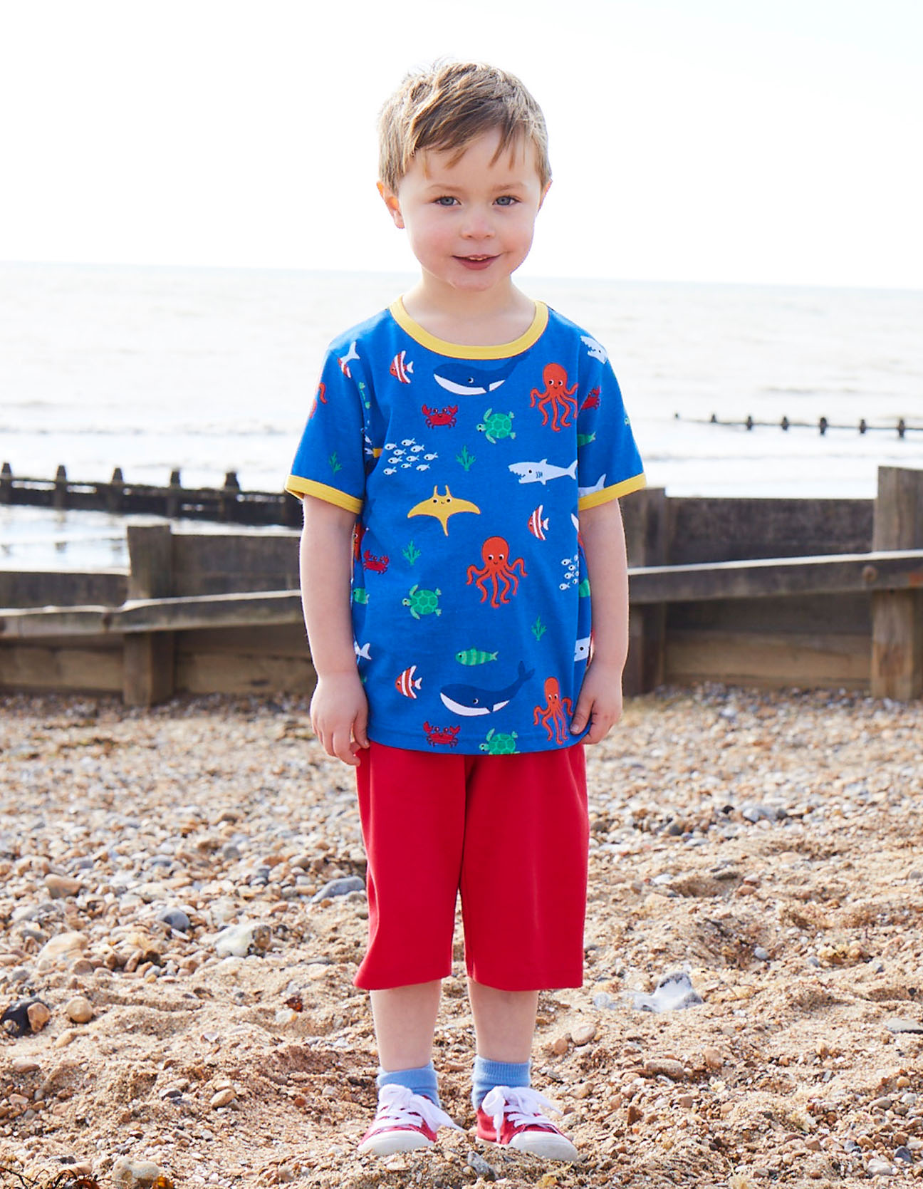Meet some fab aquatic pals on this ocean-inspired short sleeve organic T-shirt! Whales, octopus, sharks, shoals of fish – and more – are right at home on this deep-blue-coloured cotton tee. Designed with a contrasting colourful trim and neck poppers on smaller sizes for getting on and off with ease.