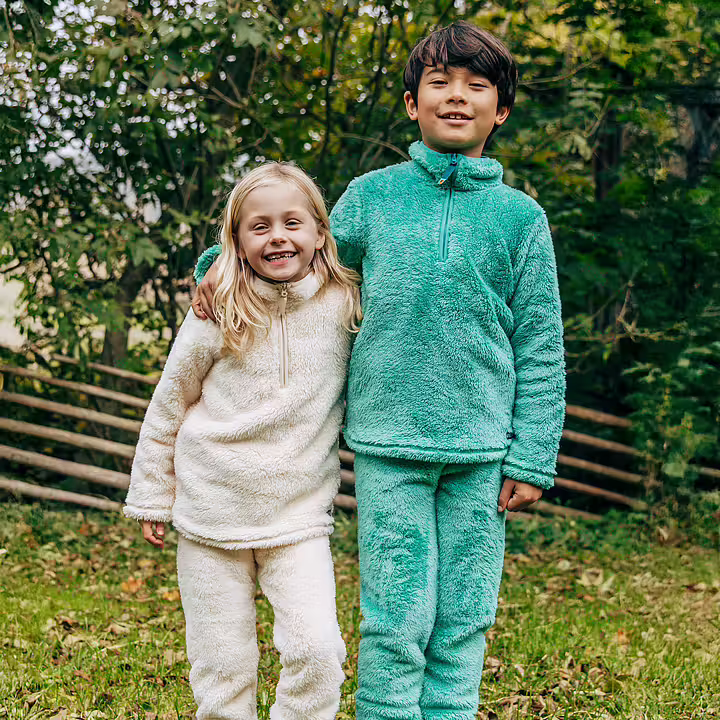 Pile fleece pants with elastics at waist and cuffs. Tumble dry at low heat to maintain fluffiness after washing.