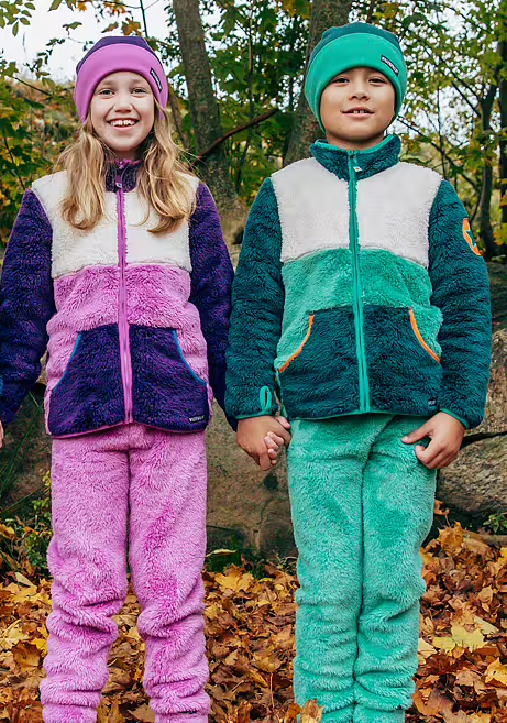 Pile fleece pants with elastics at waist and cuffs. Tumble dry at low heat to maintain fluffiness after washing.