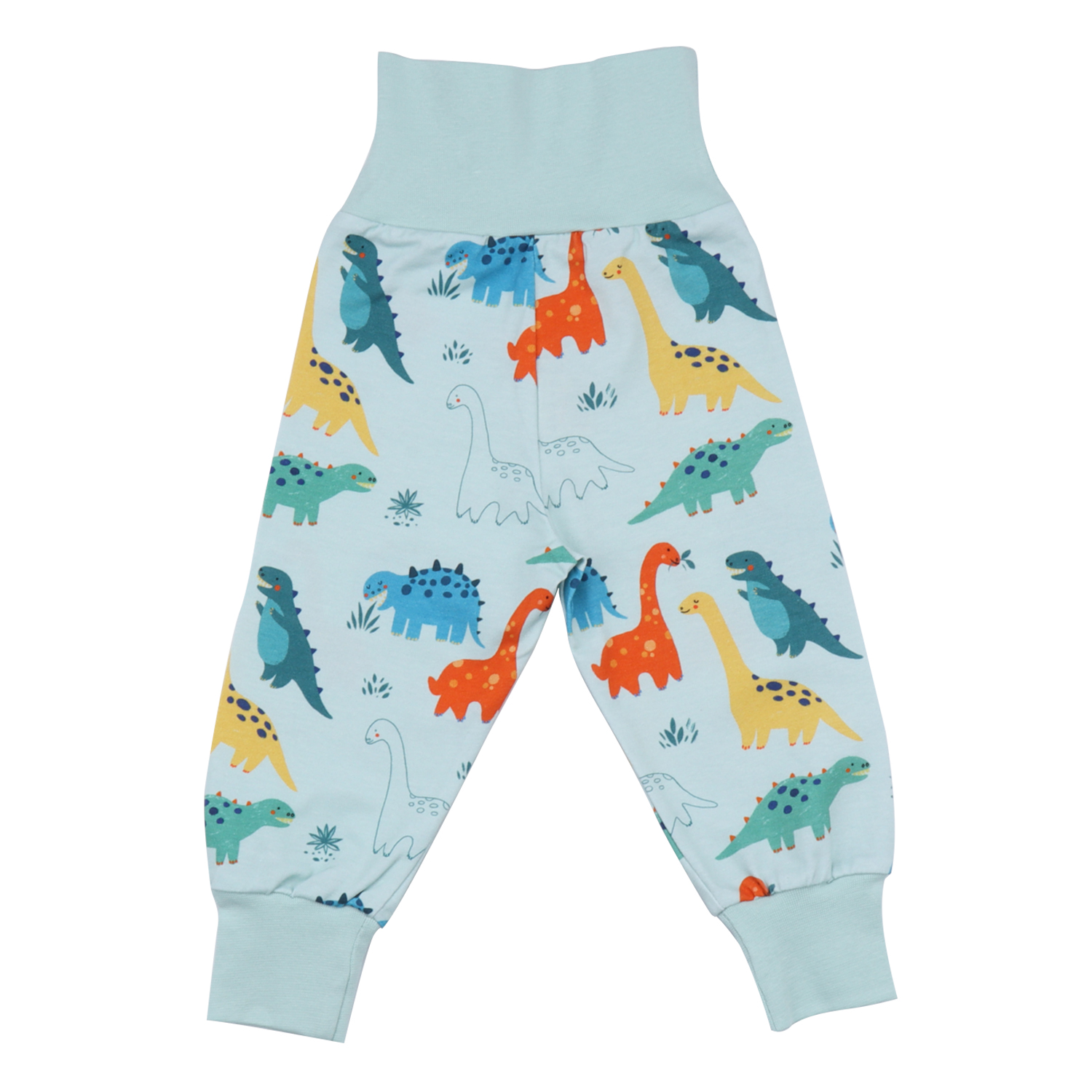 Pale blue background and trim with cute colourful cartoon dinosaurs in orange, yellow, blue and green.  Trousers with wide ribbing at waist and ankles.
