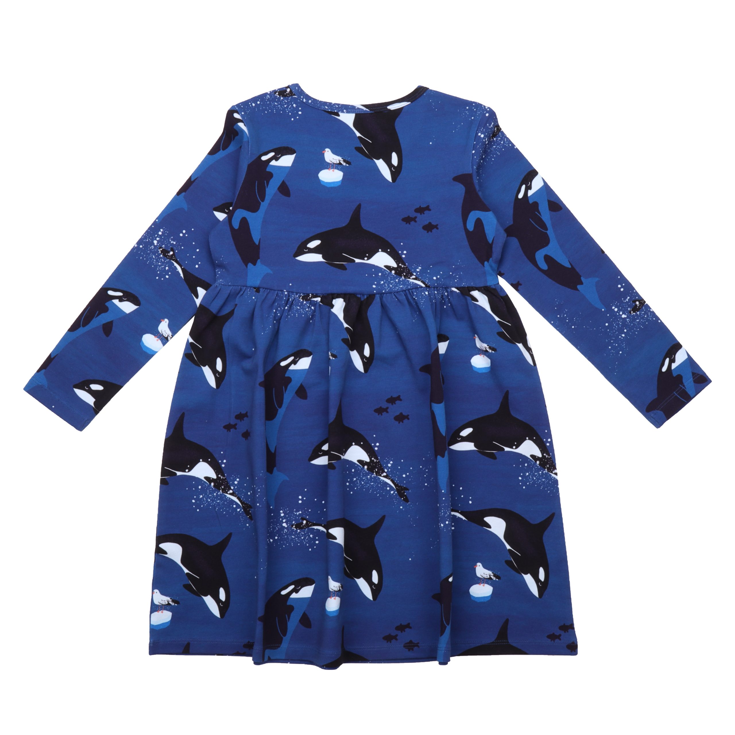 A gorgeous rich blue long sleeved dress with black and white orcas leaping through the ocean.